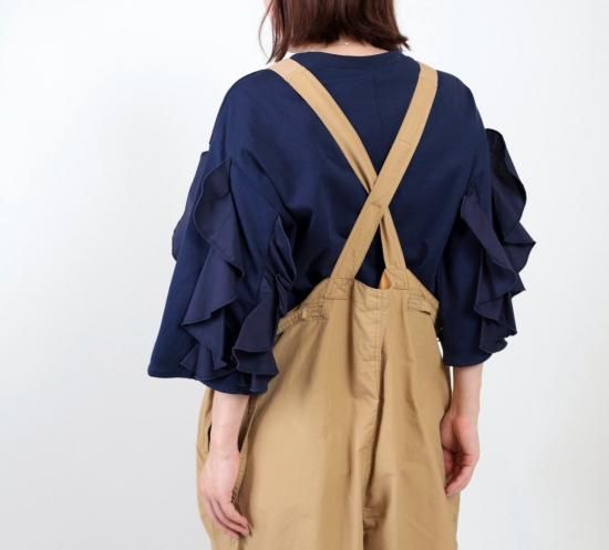 シンプルながらも華やかなディテールが魅力的なTシャツが入荷。 ベージュ、ホワイト、ネイビーの3色展開で、どのカラーも落ち着いた雰囲気を持っています。袖のフリルが特徴で、立体感がスタイルに動きを与えます。ゆったりとしたシルエットでリラックスした着心地が楽しめます。軽やかで肌触りの良い素材を使用し、フリル部分には異素材が使われているため、コントラストを楽しむことができます。カジュアルからエレガントまで幅広いスタイルに対応する万能なアイテムです。