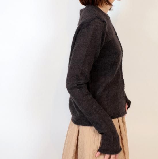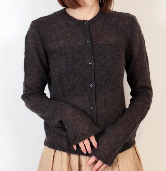 パロマウールより、バックのナンバーロゴが目をひくニットカーディガンが入荷。 エアリーな風合いに、すっきりとしたシルエットがフェミニンな印象。 ボトムスを選ばず合わせられる便利な一着です。