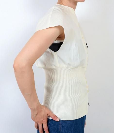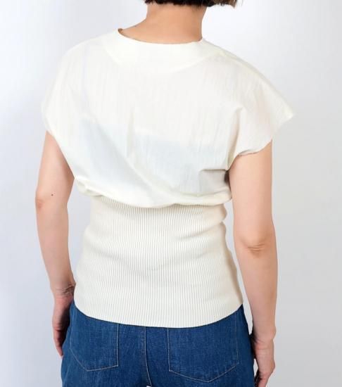 ■POINT:ペーパーライクなシワ感とハリ感のあるコットン・ナイロンシャツと、リブ生地のドッキングデザインが特徴的なトップス。 上半身がすっきり見えるバランスの取れたシルエットが魅力です。