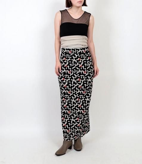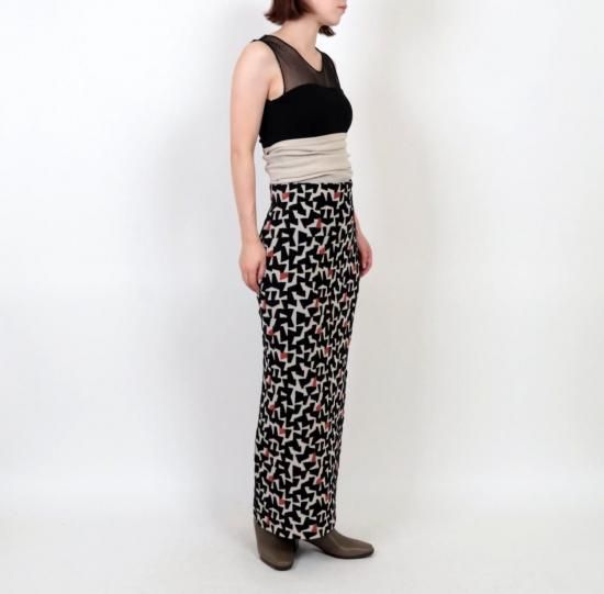 毛羽のあるモール糸と細番ストレッチ糸を合わせた素材のハイウエストベルトスカート。 台形が連なった立体感のあるジオメトリックパターン。 ウエスト上部分にはレイヤード風のストレッチ糸使用ウエストバンド付き。 (取り外し不可、スカートに内蔵可能)