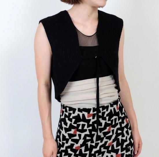 ウール混の紡毛糸とハリのある軽いストレッチ糸をミックスした暖かさとハリ感を兼ね備えたベスト。 フロントはカーブに編み上げたミニマルなデザインで開きの調節可能なテープベルト付き。