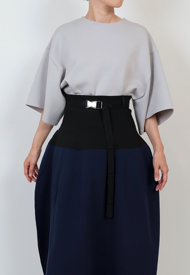 ストレッチ混ダンボール生地を使用し、程よい膨らみと立体感のあるフォルムが魅力。軽量でドライな肌触りと柔らかな風合いを持ち合わせ、ボディラインを拾いすぎず美しいシルエットを叶えます。
