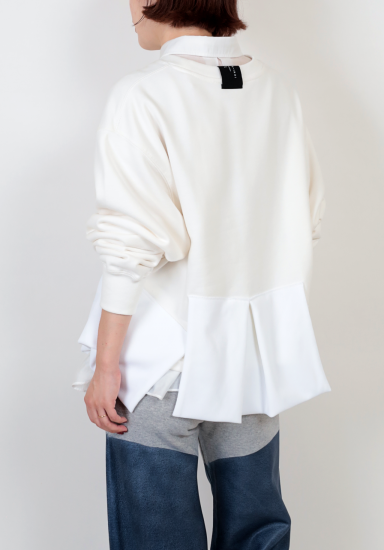 立体的なタックデザインが特徴的な1%のスウェット。 ベーシックな形ながらも、裾に施された大きめのプリーツが存在感を放ち、シンプル以上のスタイルに仕上げてくれます。 ゆったりとしたシルエットと柔らかな裏毛素材で着心地も抜群。デイリー使いはもちろん、スカートやシャツなどとのレイヤードで一気にモードな印象に。