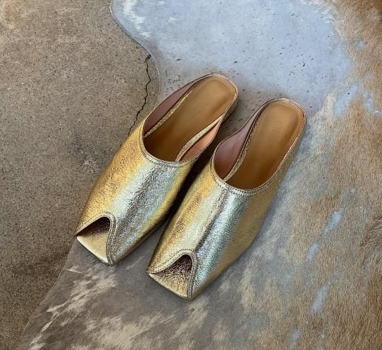 クラフト感のあるフォルムと、リュクスなゴールドの輝きが目を惹くモードな一足。 艶やかなメタリックレザーは光の当たり方で表情が変わり、スタイリングのアクセントとして抜群の存在感を放ちます。
