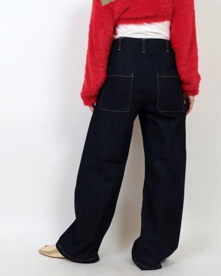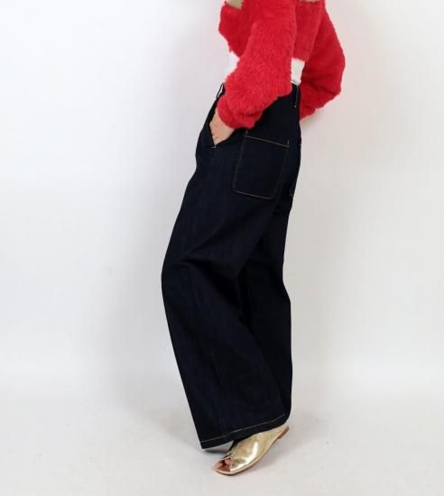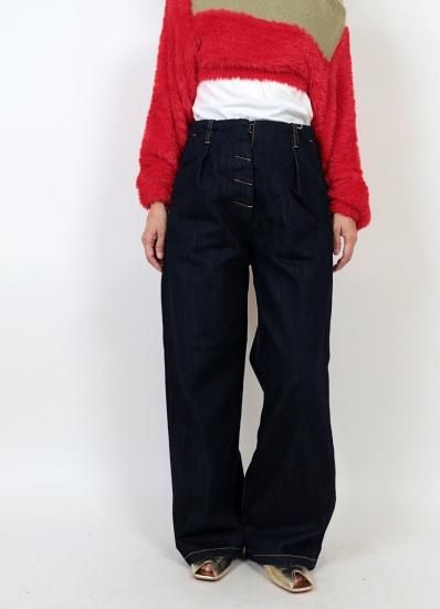 深みのあるワンウォッシュデニムが上品な印象を添える、ハイライズのバギーパンツ。 11ozデニムを使用し、フロントのタックで生まれる立体感とワイドシルエットが、スタイリングにモードな存在感をプラスします。