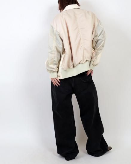 デニムジャケットとMA-1を掛け合わせたような、usu galleryらしい異素材コンビのライトアウター。 しっかりとした綿100%のデニム地をベースに、袖や背面にはナイロン素材をドッキング。 異なる質感の組み合わせが、立体的で印象的なシルエットを生み出します。 ゆったりとしたシルエットと程よい光沢感のある切り替えが、カジュアルながらモードな雰囲気に。 裏地には鮮やかなオレンジカラーを配し、袖口や裾からちらりと見える差し色が遊び心を添えます。 デニムのタフさとMA-1の軽やかさを兼ね備えた一枚。 ワイドパンツやロングスカートに合わせて、抜け感のあるスタイリングを楽しめます。